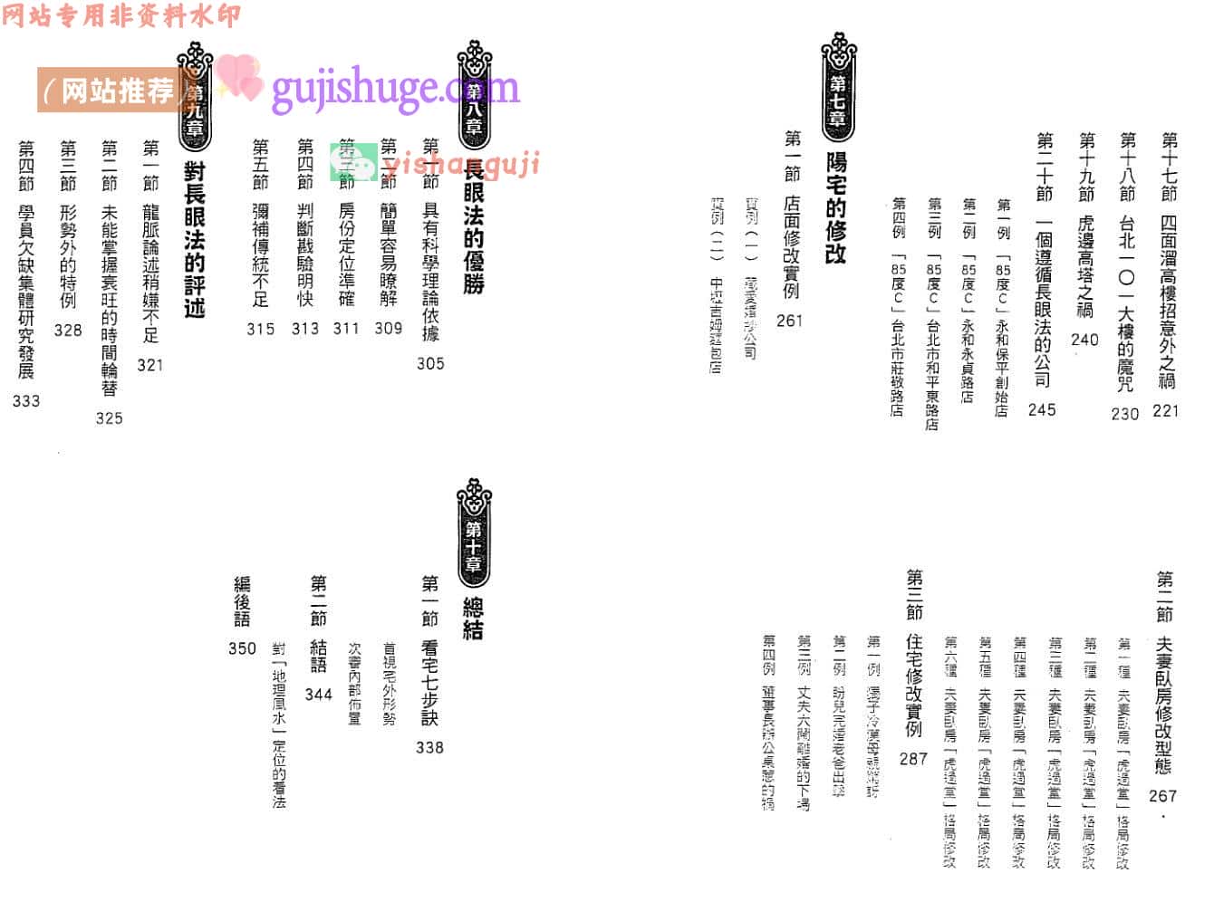 为了方便读者,在本书的最後列出「看宅七步诀」,让读者可轻轻松松自行勘察自家住宅,自我检验。书中的方法,可以复制,只要地理形势符合,没有不应证。