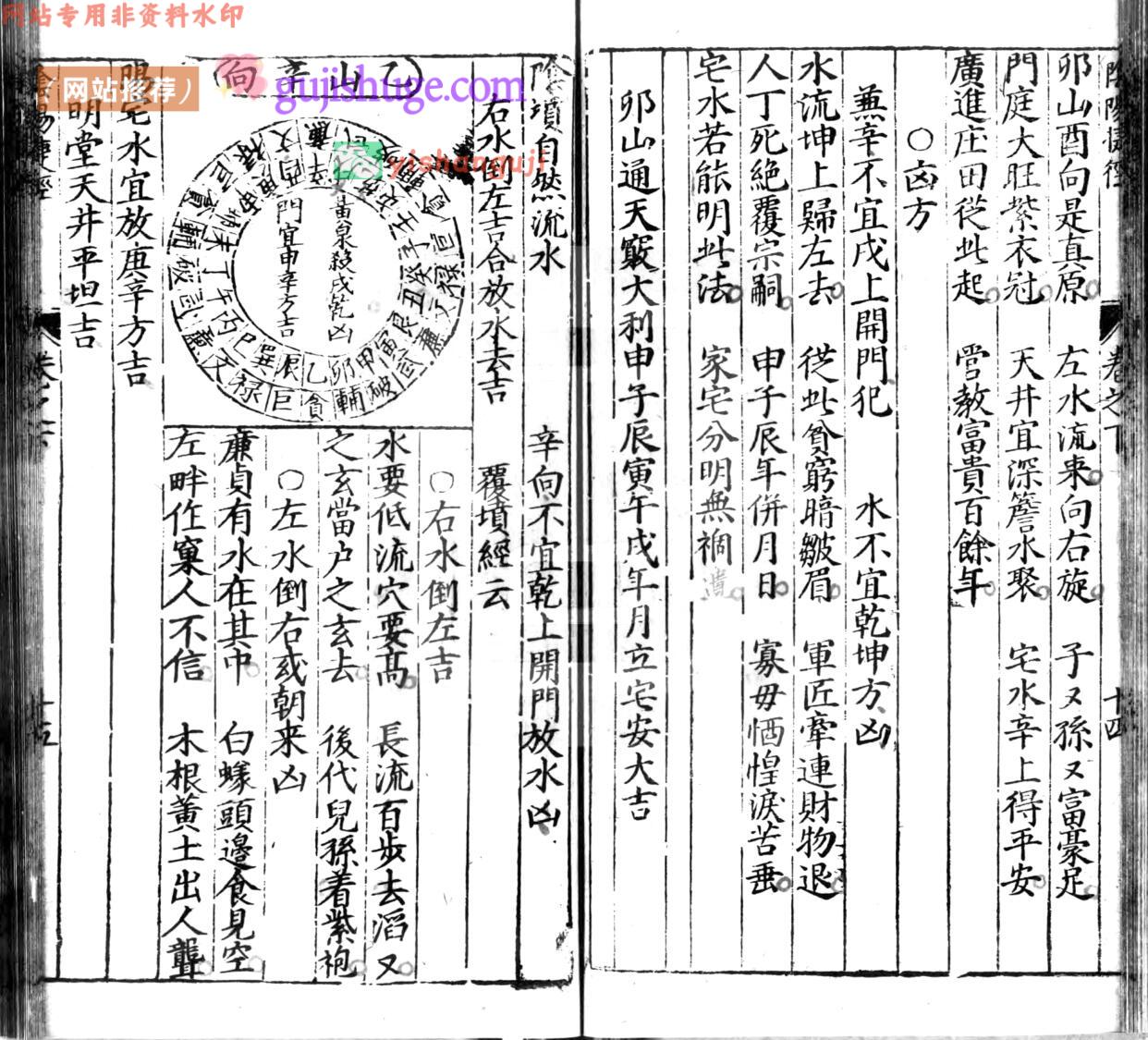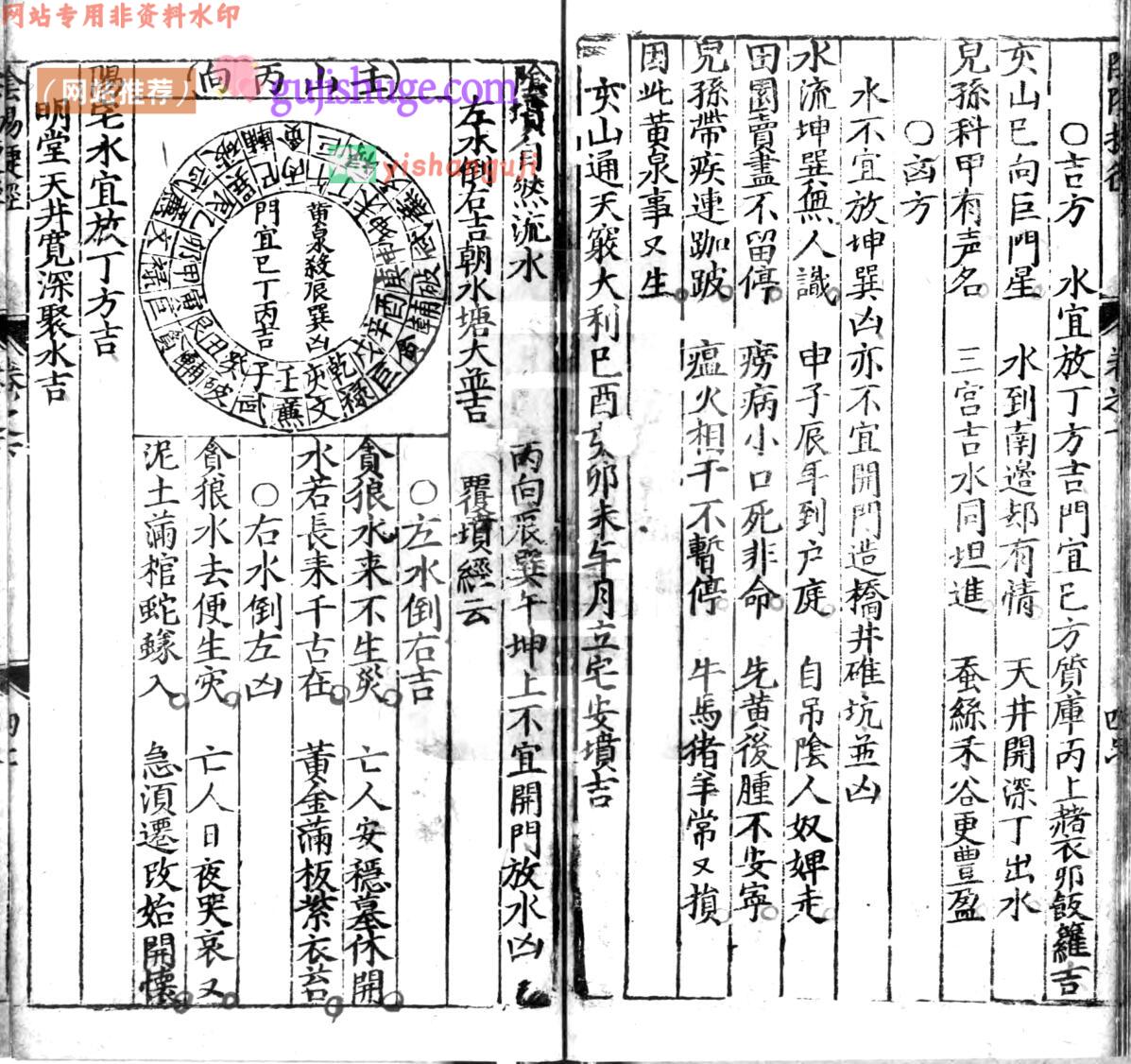 内容提要:杨松开路放水经总论。杨松入门断诀。六寸金坐向秘诀。九星定位及变化总诀。交流水出入断诀。论宅折水进益断诀。论宅折水凶祸断诀。门路凶砂断诀。论木根穿棺诀。断水浸尸诀。断白蚁入棺诀。男子山旺。女人山高。二十四位水法吉凶。论变通水法歌诀。论黄泉门路水沟天机诀云。定门灵应经。宋国师夹竹梅花断。砂法断。水法断。又杂断诗云。二十四向吉凶水法。子午寅申辰成。亥卯未已酉丑。王癸艮甲乙巽丁坤庚辛。丙干。二十四山起贪狼。黄泉总断歌。阴阳历法捷径。一玄武凶星。二朱雀凶星。三白虎凶星。四青龙吉星。五金匮吉星。六黑道凶星。七太阴凶星o八金堂吉星。九勾陈凶星。阴阳历法捷径总题。二十四向图式等
