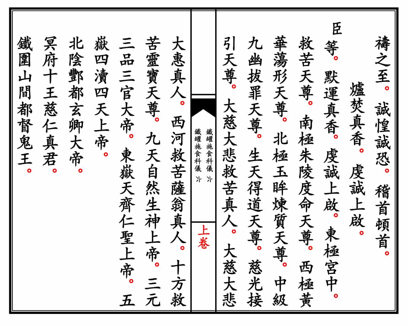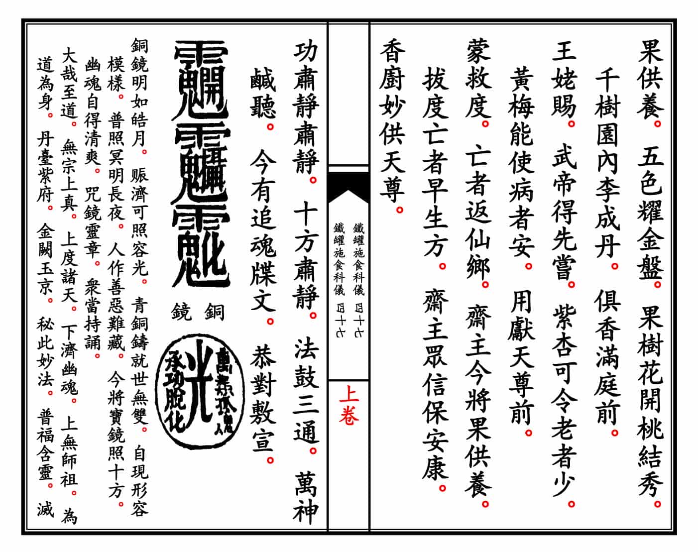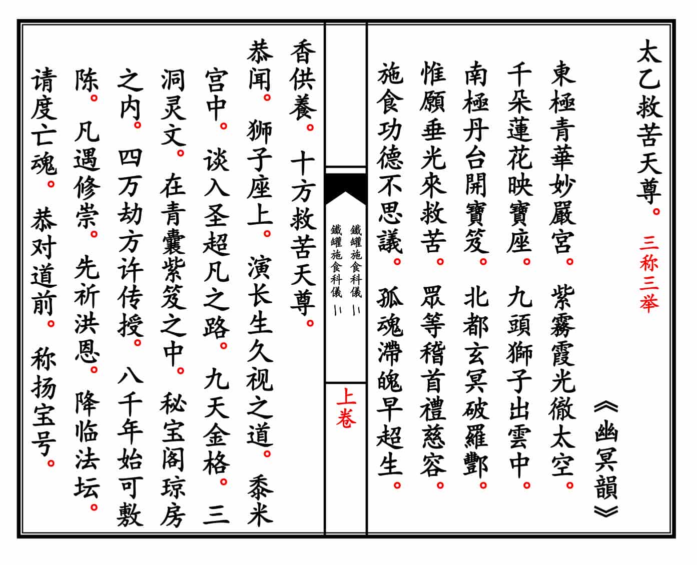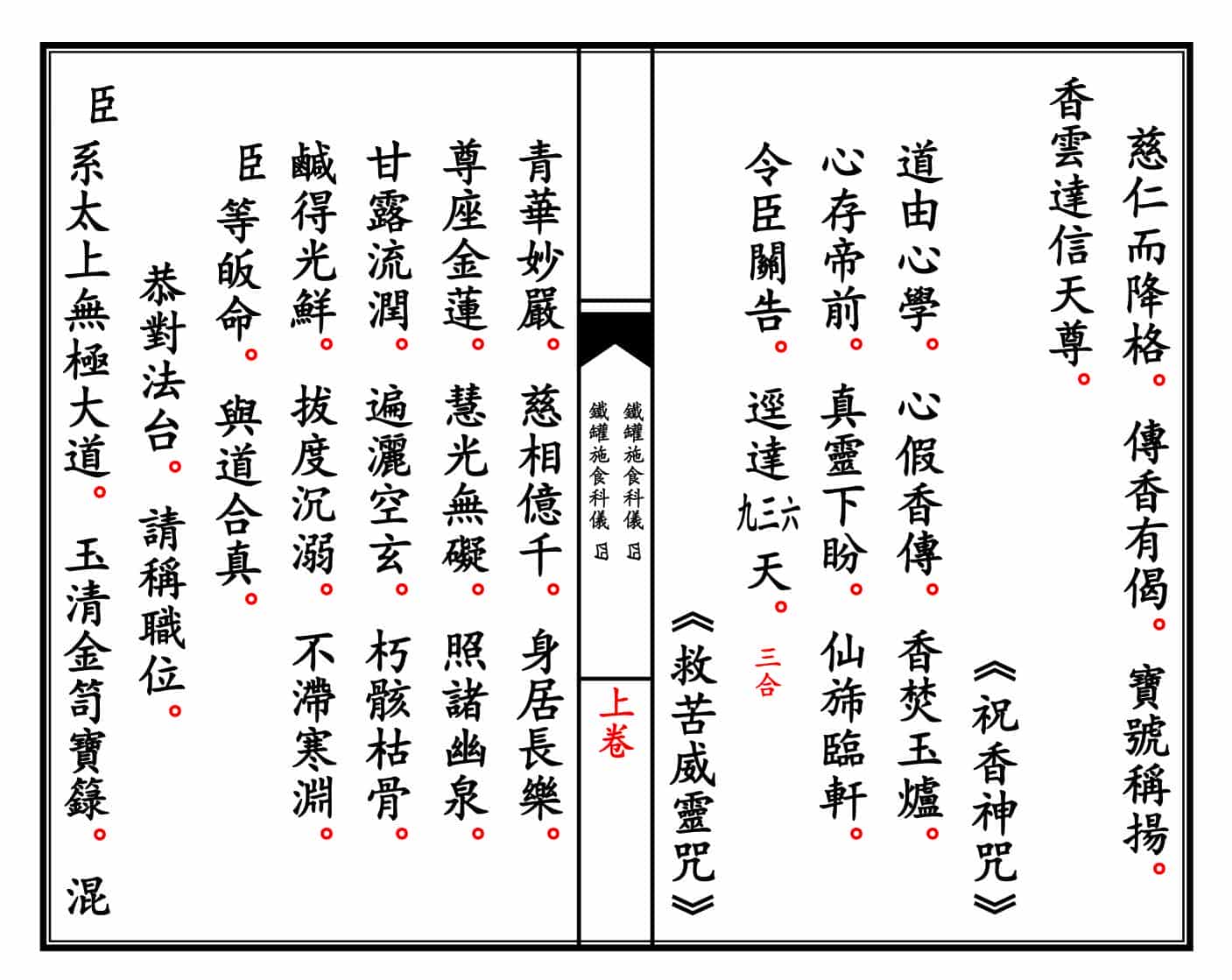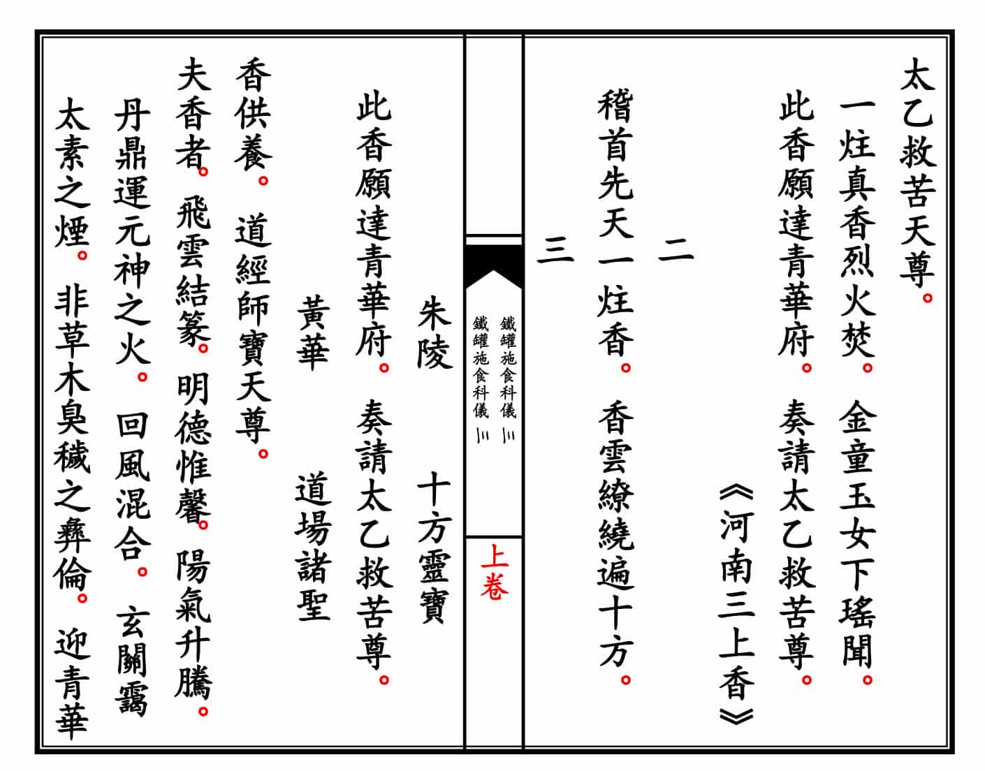 简介:《青玄济炼焰口铁罐施食科仪》上下卷精排线装打印母版。道家科仪相关书籍。道教用于超度亡魂的重要科仪文本,又称《铁罐施食》或《青玄济炼焰口》。主要用于中元节、清明、亡者忌日等场合,旨在通过诵经、施食、炼度等方式超度亡魂,解除其饥渴之苦,助其脱离幽冥、往生仙界。——)古籍书阁